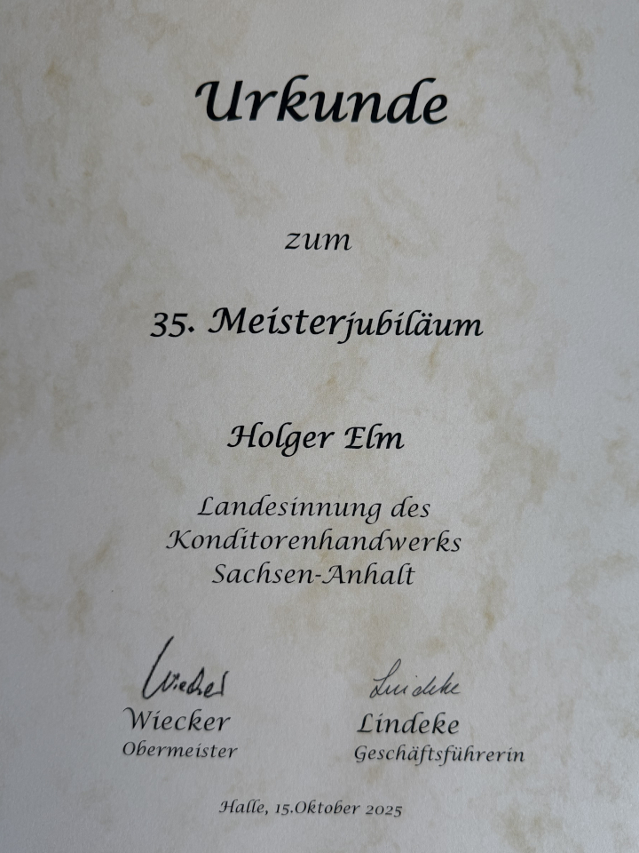 Letzte Woche wurde dem Chef des Hauses, mit etwas Verspätung, die Urkunde zum 35. jährigem Meisterjubiläum überreicht. Wir sind stolz!
